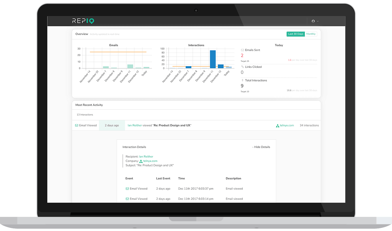 My role included establishing a design system and style guidelines to ensure a consistent user experience. I directed and defined the design and user experience for the RepIQ web application, creating UI deliverables ranging from sketches to functional prototypes. The RepIQ platform ranged in features from email tracking to in-depth company and people data, including analysis and data insights.